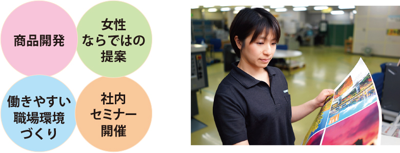 従業員がいきいきと働くことのできる職場環境にするためには、心身ともに健康に働ける安全で快適な環境づくりが必要です。日進堂印刷所では、働きやすい職場環境を目指し、社内全体で職場環境整備の推進、従業員のメンタルケアなどの取り組みを行っています。